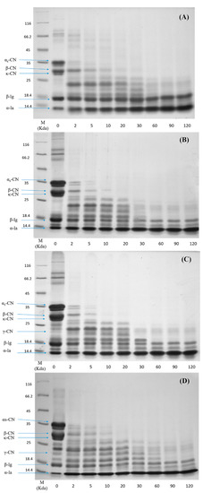 Sodium dodecyl sulfate polyacrylamide gel electrophoresis (SDS-PAGE) profiles of the in vitro gastric digestion of (A) raw milk, (B) pasteurized milk, (C) pasteurized milk upon 3 days of storage, and (D) pasteurized milk upon 7 days of storage. Lane M shows molecular weight markers. The number at the bottom of each lane represents the time of digestion (min).