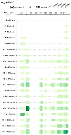 Peptide profiles originating from αs1-casein during the in vitro gastric digestion of raw milk (RM), pasteurized milk (PM0d), pasteurized milk upon 3 days of storage (PM3d), and pasteurized milk upon 7 days of storage (PM7d). (A) At each amino acid residue along the protein, the height of the green bars is proportional to the count of peptides overlapping this position; (B) the intensity of the color (green) is proportional to the sum of the peptide intensities overlapping this position.