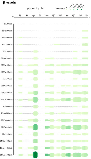 The peptides identified were matched with the primary structure of the major proteins (αs1-CN, αs2-CN, β-CN, κ-CN, and β-Lg) in milk to deduce the origins of and the differences in peptide profiles released upon pasteurization and storage at 10, 30, 60, and 120 min of digestion. Overall, the sequence coverages of the proteins upon processing and storage were increased with the time of digestion, despite a slight reduction of β-CN in PM7d at 120 min of digestion (Supplementary Materials Figure S3). Higher coverage rates of parent proteins in heated milk were more abundant compared to those in raw milk. A high number of peptides were found in stored milk compared to both raw and pasteurized milk at day 0.