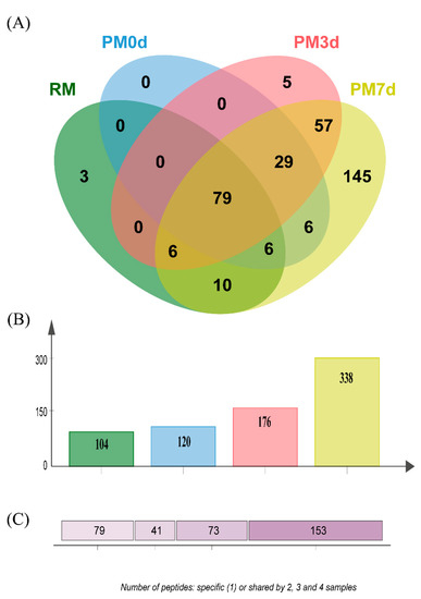 Venn diagram analysis of the identified peptides (A) from raw milk (RM), pasteurized milk (PM0d), pasteurized milk upon 3 days of storage (PM3d), and pasteurized milk upon 7 days of storage (PM7d) under in vitro digestion; (B) the number of peptides identified from each sample; (C) the number of specific (1) and shared peptides by 2, 3, and 4 samples.