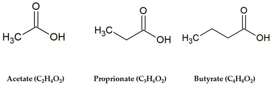 Notably, fermentation has been indicated as a tool to enhance the nutritional value of foods and beverages, in terms of both increased bioavailability of bioactive compounds (i.e., polyphenols) and production of health-promoting end-products. Among the latter, short-chain fatty acids (SCFAs) are emerging as some of the most studied compounds in the last decade, due to their proven beneficial impact on human health. SCFAs are small organic monocarboxylic acids with different chain lengths, ranging from two to six carbon atoms. They are prevalently produced by gut microbiota as end-products of fermentation of dietary polysaccharides, including fiber and resistant starch. The most representative SCFAs are acetic acid (C2), propionic acid (C3) and butyric acid (C4) (Figure 1), produced in a molar rate of about 60:20:20, respectively [5].