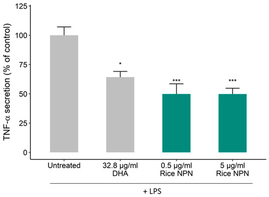Effect of rice natural peptide network (NPN) on lipopolysaccharides (LPS)-induced TNF-α secretion from differentiated THP-1 macrophages. THP-1 macrophages were treated with rice NPN (0.5 and 5 µg/mL) for 24 h before treating with 100 ng/mL of LPS for 24 h. The secretion of TNF-α was quantified by ELISA. Data presented are the mean ± SEM of at least 3 independent experiments (* p < 0.05, *** p < 0.001).