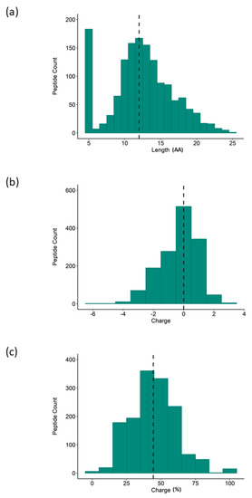 Physicochemical properties of rice NPN peptide profile as determined by LC-MS/MS. Histogram representation of rice NPN peptide distribution according to (a) length of peptide sequence, (b) charge of constituent peptides, and (c) percentage of hydrophobic residues (Hydrophobicity; peptide counts are displayed on the y axis; dashed line represents the median.