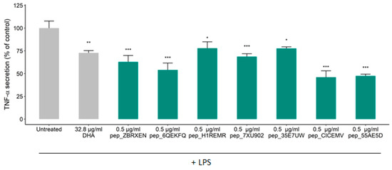 Effects of rice NPN constituent peptides on TNF-α secretion from differentiated THP-1 macrophages. Effect of treatment on the secretion of TNF-α in THP-1 differentiated macrophages after treatment with LPS. THP-1 macrophages were treated with predicted peptides (0.5 µg/mL), or media alone (Untreated) for 24 h before incubation with 100 ng/mL of LPS for 24 h. The secretion of TNF-α was quantified by ELISA. Data presented are the mean ± SEM of at least 3 independent experiments (* p < 0.05, ** p < 0.01, *** p < 0.001).