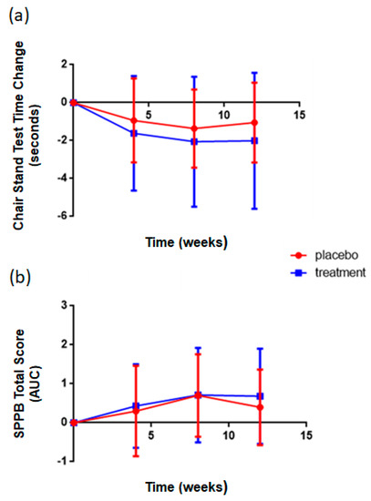 A short physical performance battery (SPPB) test score was generated at baseline and week 12. The SPPB is a group of measures that combines the results of the gait speed, chair stand and balance tests [41]. It has been used as a predictive tool for possible disability and can aid in the monitoring of function in older people. The scores range from 0 (worst performance) to 12 (best performance). The SPPB has been shown to have predictive validity showing a gradient of risk for mortality, nursing home admission, and disability. For the Short Physical Performance Battery (SPPB) testing, a combination of balance tests, gait speeds, and strengths were assessed as follows. For the balance tests, the subject must be able to stand unassisted without the use of a cane or walker, although assistance could be provided to allow the subject to stand. If at any point, the subject felt it was unsafe to carry out the test, the test was skipped and recorded as such. All movements were first demonstrated. Firstly, subjects were asked to stand with their feet together for 10 s. If the subject successfully carried out the task a score of 1 was given, otherwise a score of 0 was given and the assessor moved on to the gait speed test. In the case of a successful test, a semi-tandem stand test was performed. As before, this was demonstrated first. Subjects were asked to stand with the side of the heel of one foot touching the big toe of the other foot for 10 s. If the subject successfully carried out the task a score of 1 was given, otherwise a score of 0 was given and the assessor moved on to the gait speed test. In the case of a successful test, a tandem stand test was performed. The subject was asked to stand with the heel of one foot in front of and touching the toes of the other foot for 10 s. If the subject successfully carried out the task a score of 2 was given, if the subject held the stance for 3–9.99 s, a score of 1 was given, and for <3 s, a score of 0 was given. The sum of these scores was calculated for an overall score for each subject.