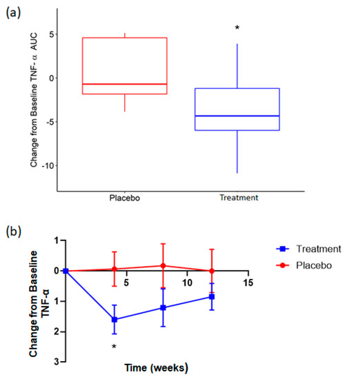 Concentrations of circulating cytokines (TNF-α, IL-1β and IL-6) and the inflammatory marker CRP were analyzed across 12 weeks in both cohorts. Total area under the curve (AUC) was used to compare the effect of rice NPN supplementation on these markers over the entire study period. AUC for TNF-α compared to baseline showed a significantly greater reduction (p = 0.03) for rice NPN compared to placebo (Figure 5a). When each study time point was subsequently assessed, at week 4 rice NPN was found to display a greater decrease (p = 0.04) in circulating TNF-α from baseline than placebo (Figure 5b). While the overall decrease from baseline for TNF-α continued to be greater for rice NPN compared to placebo at week 8 and week 12, this was not significant and diminished with each consecutive time point (Figure 5b). AUC change from baseline for IL-1β, IL-6 and CRP showed no significant differences between treatment groups (see Figure S4a–c, respectively).