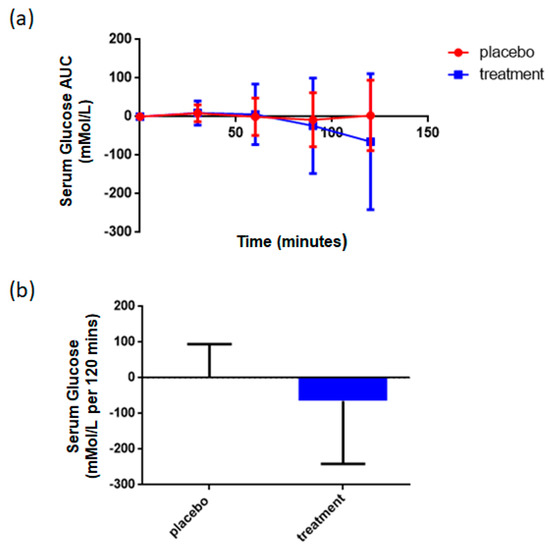 Effect of rice NPN supplementation on serum concentrations of glucose. (a) The total area under the curve (AUC) for serum glucose (mmol/l) at various intervals after the start of consumption of either placebo or rice NPN (treatment), starting with “0” at t = 0. Each point represents the mean value + 1 x +/− standard deviation of at least 9 observations in placebo and at least 24 in rice NPN group. (b) Change in total area under the curve (per 120 min) with respect to the difference in outcome between visits 2 and 5. No outliers removed. Each symbol represents the mean + 1 x +/− standard deviation of 9 persons (in placebo) or 24 persons (in rice NPN group).