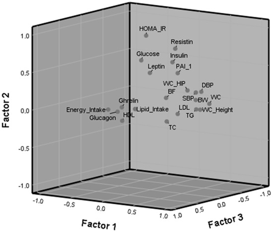 Variables in the rotated space according to the three factors (components). Higher loadings in Factor 1: waist circumference (WC), diastolic (DBP) and systolic blood pressure (SBP), body weight (BW), WC_hip and WC_height ratios and triglycerides (TG); in Factor 2: Homeostasis Model Assessment index to estimate insulin resistance (HOMA-IR), resistin, glucose, insulin, leptin and plasminogen activator inhibitor-1 (PAI-1); and in Factor 3: energy and lipid intake followed by glucagon.