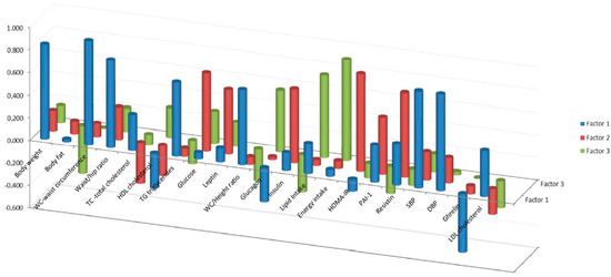 Coefficients calculated for each variable in Factor 1: waist circumference (WC), diastolic (DBP) and systolic blood pressure (SBP), body weight (BW), WC_hip and WC_height ratios and triglycerides (TG); in Factor 2: Homeostasis Model Assessment index to estimate insulin resistance (HOMA-IR), resistin, glucose, insulin, leptin and plasminogen activator inhibitor-1 (PAI-1); and in Factor 3: energy and lipid intake followed by glucagon.