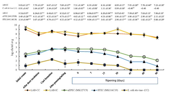 Therefore, the aim of this study was to evaluate the behaviour of two strains of pathogenic E. coli—non-O157 STEC and aEPEC—isolated from milk, during the manufacturing and ripening of raw cow’s milk cheese.