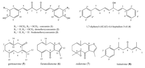 There are more than 100 different sesquiterpenoids reported from Curcuma rhizomes [20], and these secondary bioactive metabolites are also responsible for some of the biological activities observed from the rhizomes of Curcuma species. Therefore, we isolated three germacrane-type sesquiterpenoids, germacrone (5), furanodienone (6), and zederone (7), which is the first report from C. latifolia. In addition, ar-turmerone (8) was isolated from C. zedoaria for the first time. Germacrone (5) is known to exhibit anti-inflammatory [21], antiviral [22], and anti-cancer activities [23], and was found in the various Curcuma species, such as C. aeruginosa, C. amanda, C. aromatica, C. xanthrrhiza, and C. zedoaria.