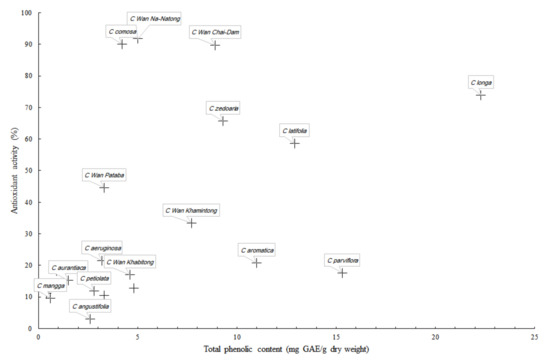 From the results, it was clear that total phenolic contents of Curcuma extracts are not necessarily correlated with the antioxidant activity (Figure 2). Among the three most antioxidant Curcuma rhizomes, C. Wan Na-Natong and C. Wan Chai-Dam are the new species that have never been extensively studied, regardless of their local popularity. The correlation chart (Figure 2) shows that the total phenolic content and DPPH radical scavenging antioxidant activity among the Curcuma species are not necessarily linearly correlated. This is believed to be due to different phytochemical compositions of Curcuma species, as discussed below.