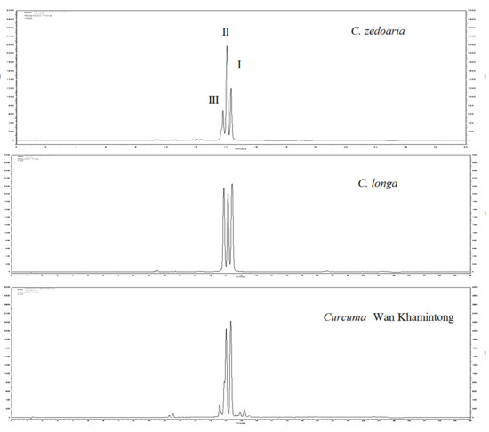 HPLC chromatogram (420 nm) for C. zedoaria, C. longa, and Curcuma Wan Khamintong; I: curcumin (1), II: demethoxycurcumin (2), III: bisdemethoxycurcumin (3).
