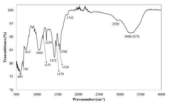 The FTIR analysis of AV revealed the polar nature of the gel as four main functional groups (OH, CO, CH3 and COO) were predominant in the AV spectrum (Figure 1). The wide band observed in the range of 3000–3676 cm−1 was related to the stretching vibration of phenolic hydroxyl groups such as flavonoids and anthraquinones, among others [15,45,46]. The band observed approximately at 2920 cm−1 is characteristic of aliphatic groups (–CH2 and –CH3) whereas the C=O stretching vibrations of carbonyl groups of polysaccharides and gelatin matrix appeared at 1742 cm−1 [46]. The band observed near 1560 cm−1 could be related to the N-H bending of the amide II fraction [46]. Other predominant functional groups were the asymmetric COO (band at 1520 cm−1), symmetric COO (band at 1470 cm−1), CH3 stretching vibrations (band at 1432 cm−1) and C–O–C stretches of acetyl groups of esters and phenols (band at 1227 cm−1) [47]. Regarding the bands related to the presence of polysaccharides, an intense band in the range of 1151–1062 cm−1 was associated with the presence of galactose and glucan units [48]; whereas peaks at 812 cm−1 and 746 cm−1 reflect the characteristic signals of glucose and mannose, respectively [49]. Finally, the absorption peaks around 605 cm−1 might be due to C-H bending indicating the presence of polymerized compounds in the AV gel [15].