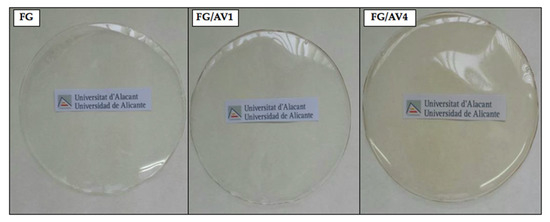 The visual appearance of the obtained films is shown in Figure 2. In general, all films showed a high visual transparency and homogeneity, which are desirable properties for food packaging applications. However, a slight yellowish coloration was observed at high AV loadings (FG/AV4) [20]. No significant differences were obtained regarding thickness values for FG (104 ± 9 µm), FG/AV1 (110 ± 20 µm) and FG/AV4 (110 ± 10 µm) suggesting that AV addition did not substantially affect the film formation process [21]. However, the addition of AV to FG induced some changes in films transparency. Indeed, transparency values of films to ultraviolet radiation (280 nm/mm) increased from 67 ± 3 for FG to 74 ± 2 for FG/AV1 and 101 ± 3 for FG/AV4, whereas transparency values to visible radiation (%) also increased with AV content from 37 ± 2 for FG to 42 ± 2 for FG/AV1 and 60 ± 2 for FG/AV4. This effect could be related to the crosslinking of polysaccharides and antioxidants present in AV with FG proteins or glycerol (plasticizer) in the film forming process [51]. In general terms, the neat visual appearance and high transparency of the studied edible films were adequate for food packaging applications in all cases, since the addition of AV to form FG/AV1 and FG/AV4 does not affect in the visual appareance of the packed product.