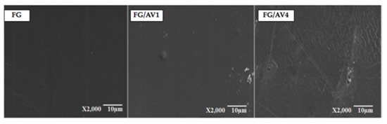 Surface micrographs obtained for FG, FG/AV1 and FG/AV4 edible films by SEM (2000×).