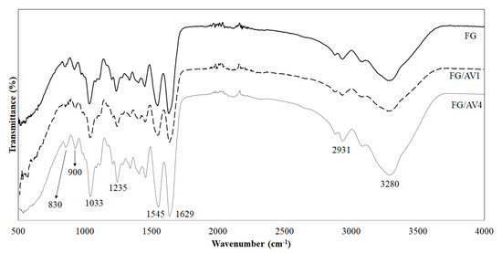 Average ATR-FTIR spectra obtained for FG, FG/AV1 and FG/AV4 edible films.