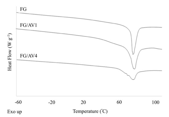 Finally, as AV content increased, a significant shift (p < 0.05) to higher wavenumbers values in bands assigned to the presence of glucose and mannose monosaccharides was observed among samples, resulting in values of 894 ± 7 cm−1 and 817 ± 6 cm−1 for FG to 913 ± 2 cm−1 and 835 ± 4 cm−1 for FG/AV4, respectively. These shifts could be correlated to conformational changes on the polymer matrix with AV addition and a good molecular affinity between FG and AV [20,33].