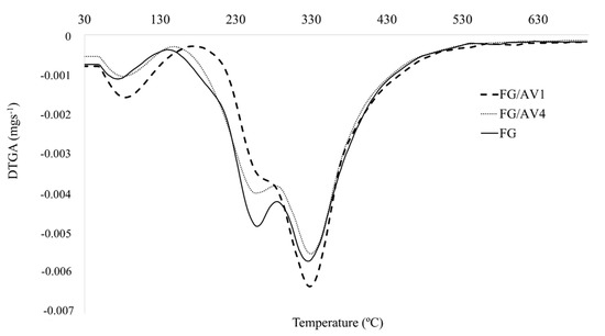 Derivative thermogravimetric (DTG) curves obtained for FG and FG/AV edible films.