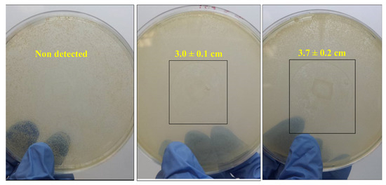 Significant differences in the antimicrobial performance of FG/AV films in contact with the two studied bacterial strains were observed. For S. aureus (Figure 7), inhibition zones of 3.0 ± 0.1 cm and 3.7 ± 0.2 cm were found for FG/AV1 and FG/AV4, respectively, in contrast to the control FG film which did not show any inhibition zone, as expected. This antibacterial activity could be attributed to the presence of polyphenols and other antioxidants in AV with ability to produce the precipitation of cell membrane proteins or having non-specific interactions with them [18,57,58], in agreement with the high TPC and antioxidant activity values obtained in this work. On the other hand, the acemannan present in AV has been reported to be also responsible for antibacterial activity [2]. In this sense, the action of AV polysaccharides against bacterial activity has been well reported, including the stimulation of phagocytic leucocytes and T cells as well as the induction of nitric oxide production to destroy bacteria [13,59]. Finally, some authors have suggested that an increase in the solubility of films could influence the release of antimicrobial components resulting in higher releasing rates [24]. In this work, the addition of AV significantly (p < 0.05) increased the solubility of films from 31 ± 1% for FG to 44 ± 1% for FG/AV4 (Table 3). Thus, it was expected that FG/AV4, with higher TPC, antioxidant activity and solubility values, would show the highest antimicrobial effect against S. aureus. However, no inhibition zones were observed for S. enterica in any of the studied films which was attributed to the additional external lipopolysaccharide membrane present in this bacterium which contributes to a higher resistance to disintegration [35]. A higher action against gram positive bacteria compared to gram negative microorganisms was also reported in Aloe Vera gel-based edible coatings to reduce the ripening process of sweet cherry [2]. According to some authors, the Aloe Vera gel extract could be used as an antifungal agent to prevent postharvest fungal diseases as it has been recently proved in papaya fruit [11,60].