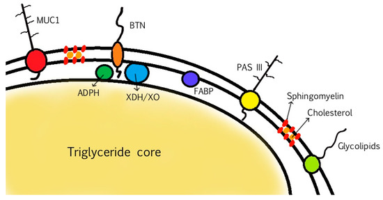 MFGM proteins account for 25–60% of the mass of the MFGM, 1–4% of total milk proteins, and 1% of the total globule mass. The proteins can be classified into integral proteins and peripheral proteins, whereas others are partially embedded or loosely attached to the membrane. During the secretion of the MFGs, the constituents are re-arranged within the apical plasma membrane and the MFGM [4,31]. The localization of the proteins thus varies—some are associated with the inner monolayer membrane, while others are associated with the outer bilayer membrane [7,28,29]. The main MFGM proteins are adipophilin (ADPH), butyrophilin (BTN), mucin 1 (MUC1), xanthine dehydrogenase/oxidase (XDH/XO), CD36, periodic acid Schiff III (PAS III), PAS 6/7, lactadherin, and fatty acid-binding protein (FABP), as is shown in Figure 2 [7,56,57].