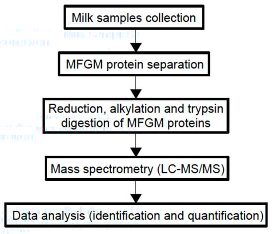 Although most of the beneficial effects of MFGM are associated with its polar lipid fraction [6], studies on MFGM proteome are increasing since MFGM proteins show bioactive properties and new technologies have enabled more detailed analyses of the MFGM proteome. Comparative proteomic analyses have been performed to understand how proteomes vary between different species and between different stages of lactation [63]. Figure 3 shows the general experimental workflow.
