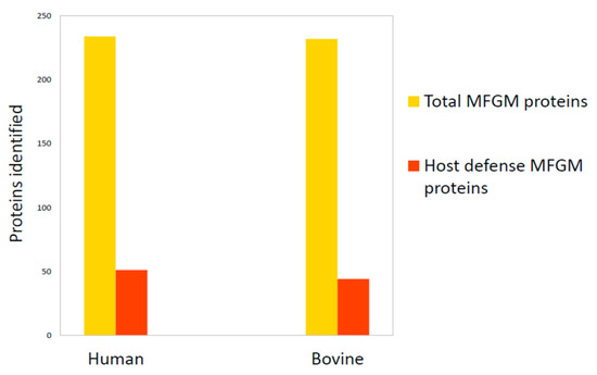 However, apart from some common features, human and bovine MFGM are different in terms of the fraction of proteome involved in host defense. In 2011, Hettinga and collaborators [66] verified that the total number of host defense MFGM proteins was similar between humans (51 out of 234 proteins identified in human MFGM) and bovines (44 out of 232 proteins identified in bovine MFGM) (Figure 4). However, the human MFGM was more enriched with Igs than bovine MFGM, while bovine MFGM was more enriched with antibacterial proteins. This important information helped identify the main proteins with immunity-promoting properties for newborns [66].