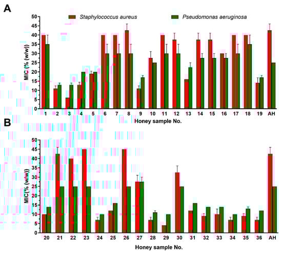 Antibacterial activity of the commercial honey samples (n = 36) purchased in Slovakia. The antibacterial activity was evaluated against two bacterial pathogens by a minimum inhibitory concentration (MIC) assay. (A) Honey samples purchased from supermarket (n = 19) (B) Honey samples purchased from local food shop (n = 17). The data are expressed as the mean values with the standard deviation (SD). AH—artificial honey.