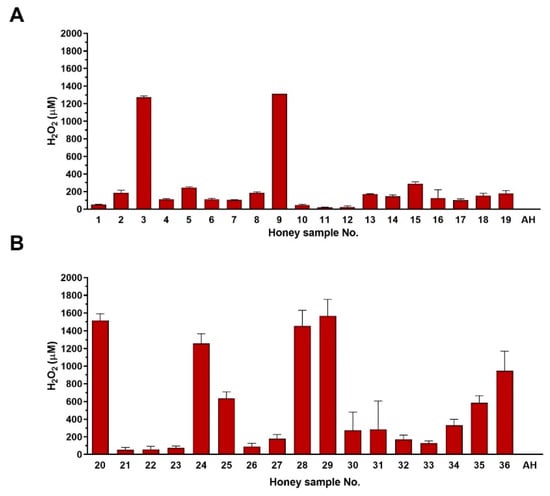 Hydrogen peroxide (H2O2) content in commercial honey samples (n = 36). (A) supermarket honey samples (n = 19), (B) local food shop honey samples (n = 17). Determination of the H2O2 content was carried out in diluted honey samples (40% (w/w) after 24 h of incubation at 37 °C. The data are expressed as the mean values with the standard deviation (SD). AH—artificial honey.