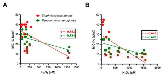 The relationship between the content of H2O2 and the antibacterial activity of commercial honeys: (A) supermarket honey samples (n = 19), (B) local food shop honey samples (n = 17) against two bacterial isolates. A Pearson correlation test was used for the correlation analysis.