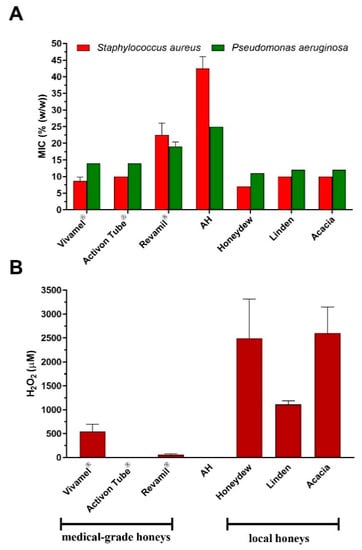 Antibacterial activity and the content of H2O2 in the honey samples from local beekeepers (n = 3) and medical-grade honey (n = 3). (A) The antibacterial activity was evaluated against two bacterial pathogens by a minimum inhibitory concentration (MIC) assay. (B) Determination of the H2O2 content was carried out in diluted honey samples (40% (w/w) after 24 h of incubation at 37 °C. The data are expressed as mean values with the standard deviation (SD).