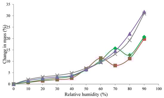 Change in mass (%) of whey protein concentrate (WPC) powders during sorption from 0 to 90% relative humidity (RH) at 25 °C; (■) WPC 20, (♦) WPC 35, (▲) WPC 50, and (X) WPC 65.