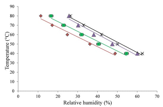 Powder samples (2 g) were transferred into glass vials and dried overnight in a vacuum oven (Jeio Tech 665 L Vacuum Oven OV-12, Fisher Scientific, Leicestershire, UK) at 45 °C. The dried samples were equilibrated in evacuated desiccators over saturated salt solutions of LiCl, CH3COOK, MgCl2, and K2CO3 (Sigma Chemical Co., St. Louis, MO, USA), with corresponding relative water vapor pressures (RVPs) of 11.4%, 23.1%, 33.2%, and 44.1%, respectively, at room temperature (23–24 °C) for 14 days.