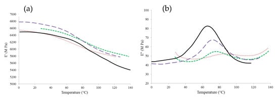Figure 3 shows the mechanical α-relaxations for the WPC 65 over a range of aw (0.11–0.44). As expected, significant changes occurred in the molecular mobility of the powder with increasing temperature. The magnitude of these changes, especially for the loss moduli (Figure 3b), were found to increase with increasing aw, and this general trend was evident in all powders examined. The increased magnitude of the changes with increasing aw is a result of the plasticizing effect of water, which increases the molecular mobility of the system [6]. This causes a decrease in the viscosity of the particle surface, leading to the onset of sticking [37].