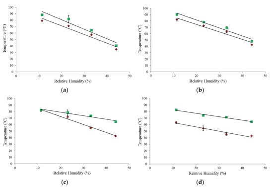 α-relaxation profiles determined from the Ta onset (♦) and the Ta peak (■) values of the dynamic mechanical analysis (DMA) method for whey protein concentrate (WPC) powders; (a) WPC 20, (b) WPC 35, (c) WPC 50, and (d) WPC 65.