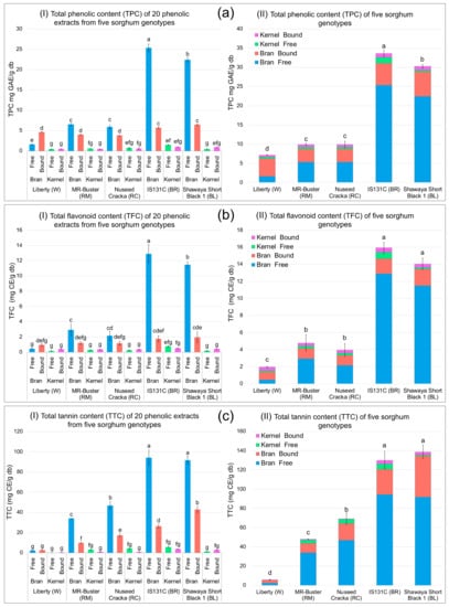 Total phenolic content, total flavonoid content and total tannin content of 20 sorghum phenolic extracts (a-I, b-I and c-I, respectively) and of five sorghum genotypes (a-II, b-II and c-II, respectively). Error bars indicate ± standard deviation (n = 3). Bars with different small letters are significantly different (p < 0.05).