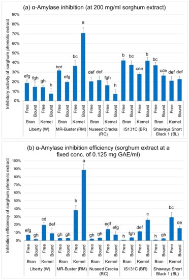 The inhibitory activities of sorghum phenolic extracts were divided by their TPC to evaluate the phenolic inhibition efficiency [24,25], i.e., the inhibitory activities of the phenolic extracts at the same phenolic concentration (Figure 2b and Figure 3b). Surprisingly, all the kernel extracts, despite their low phenolic content, showed much stronger inhibition efficiency than the bran extracts on both α-glucosidase and α-amylase, with the RB-kernel-bound extract having the highest inhibition efficiency (p < 0.05).