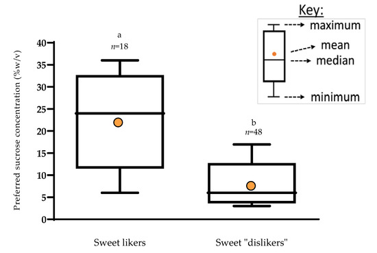 3.2. Correspondence between Sweet-Liker Status and Paired Preference Optimum Concentration for Sucrose