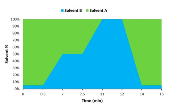 The chromatographic separation was achieved with an UHPLC system (Dionex UltiMate 3000, Thermo Scientific, Waltham, MA, USA) coupled to an ion-trap tandem mass spectrometer detector (Bruker) and a Luna Omega Polar C18 column (100 mm × 2.1 mm, 1.6 μm particle size, Phenomenex, Torrance, CA, USA) at 25 °C. A gradient elution was carried out by combining solvent A (water containing 0.2% formic acid and 5 mM ammonium acetate) and solvent B (MeOH containing 10 mM ammonium acetate) as follows: 5% B (0–0.5 min), 5–50% B (0.5–7 min), 50% B (7–7.5 min), 50–100% B (7.5–11 min), 100% B (11–12 min), 100–5% B (12–14 min). The system was re-equilibrated with the initial composition for 1 min prior to next injection, yielding a total analysis time of 15 min (Figure 1).