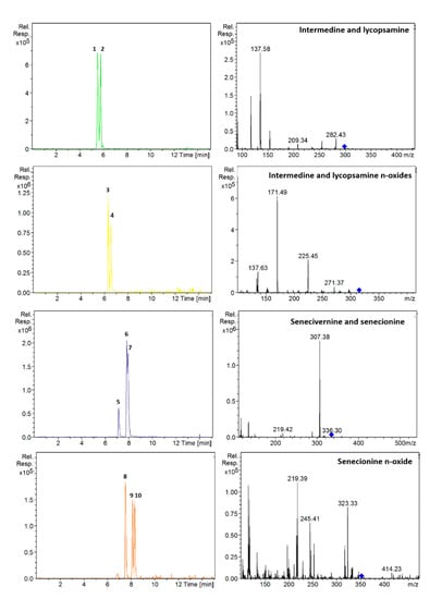 Extracted ion chromatograms and mass spectra (MS2) of: intermedine (1), lycopsamine (2), intermedine N-oxide (3), lycopsamine N-oxide (4), seneciphylline (5), senecivernine (6), senecionine (7), seneciphylline N-oxide (8), senecivernine N-oxide (9) and senecionine N-oxide (10) in a standard solution containing 100 µg/L of each analyte. Chromatographic conditions as Table 1.