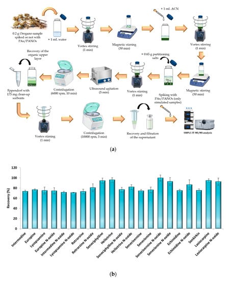 To check the efficiency of the miniaturized procedure, a recovery assay was carried out. For this purpose, five replicates of a sample (C-S15-A, as it presented the lowest values of PAs/PANOs) were subjected simultaneously to the extraction procedure in the following way: three replicates of the sample were spiked with 0.2 mL of a working standard solution of 100 µg/L containing all the target analytes (100 µg/kg of each analyte referred to the sample weighted), allowing a 20 min period for equilibration prior to the sample extraction procedure; another replicate of the sample (denoted as a simulated sample) was extracted in the same way as the others, but it was spiked with the known-amount of the analytes at the end of the sample treatment procedure (Figure 3a); the last replicate sample was extracted without spiking, so it was considered a blank sample. To calculate the recovery values, the areas of the spiked samples were compared with the areas obtained for the simulated sample, while the blank samples were used to quantify the target analytes in the samples analyzed. Good recovery results were achieved with this miniaturized procedure, as satisfactory recovery values were achieved for all the target compounds (Figure 3b). This suggests that the QuEChERS procedure can be successfully scaled down and be effective enough without a high consumption of solvents and reagents, leading to a cost-effective and environmentally friendly improved strategy.