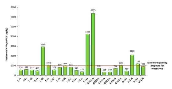 Total content of PAs/PANOs (µg/kg) found in the different oregano samples analyzed by the µ-QuEChERS method proposed. In the sample identification code, the first letter indicates: W for wild farming, O for organic farming and C for conventional farming. Samples ending with an A or B indicate same trademark samples with different lot number.