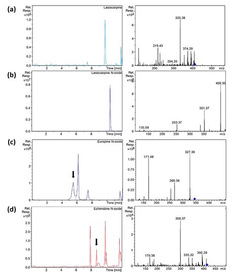 Extracted ion chromatograms and mass spectra (MS2) of (a) lasiocarpine in sample C-S10, (b) lasiocarpine N-oxide in sample C-S10, (c) europine N-oxide in sample O-S9 and (d) echimidine N-oxide in sample C-S14 after µ-QuEChERS extraction. Chromatographic conditions as Table 1.