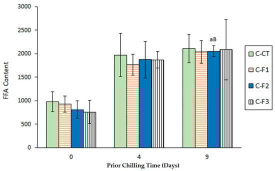 | PV (meq. active oxygen·kg−1 lipids) | C-CT | a 1.01 ± 0.24 A | a 1.31 ± 0.81 AB | a 2.14 ± 0.55 B |