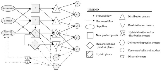 The general structure of the proposed IFRLN is illustrated in Figure 1. In the forward direction, the new product is manufactured in plants from raw materials, provided from different suppliers, i.e., whole sale contract, spot market, and recycled materials. The product is conveyed from plants to customers through distribution centers within certain safety stock levels. In the backward direction, returned products are transferred from product sellers to collection centers for testing and inspecting. After classification, returned products are conveyed to distribution centers, remanufacturing plants, and disposal centers, depending on the amount of repair required. Remanufactured products are transferred to second market customers through certain distribution centers. This model is proposed with a generic nature, but it can encompass various industries, such as electronics, apparel, and automotive industries. In fact, the model is more appropriate for industries in which products can be highly remanufactured and sold in the second market as refurbished products.
