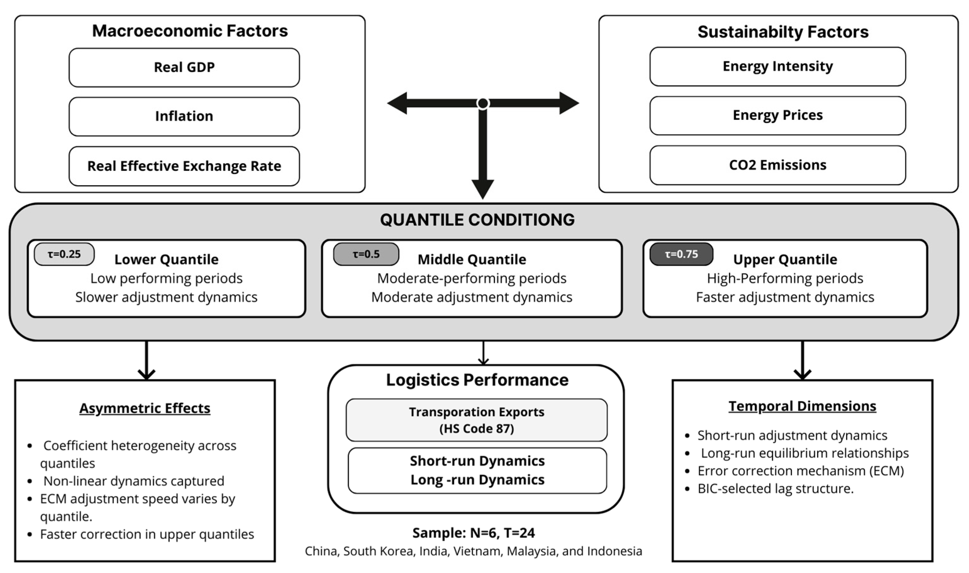 The advantage of this stratification is that it allows for asymmetric effects identification, where coefficient heterogeneity may vary across quantiles, capturing non-linear dynamics and the speed of adjustment by error correction mechanism (ECM) differing by performance level. The framework helps the study by tracing the logistics performance measured by Transportation Exports (HS Code 87). It also studies the short-run adjustment dynamics and long-run equilibrium relationships. The temporal dimensions use BIC-selected lag structures to capture dynamic relationships over time. This conceptual framework undermines the conventional one-size-fits-all policy approach by arguing that the same macro-economic and sustainability variables have different effects in a low, moderate, and high-performance period in the logistics sector. The framework thus provides the theoretical basis to the Panel Quantile ARDL (P-QARDL) technique used in this study.