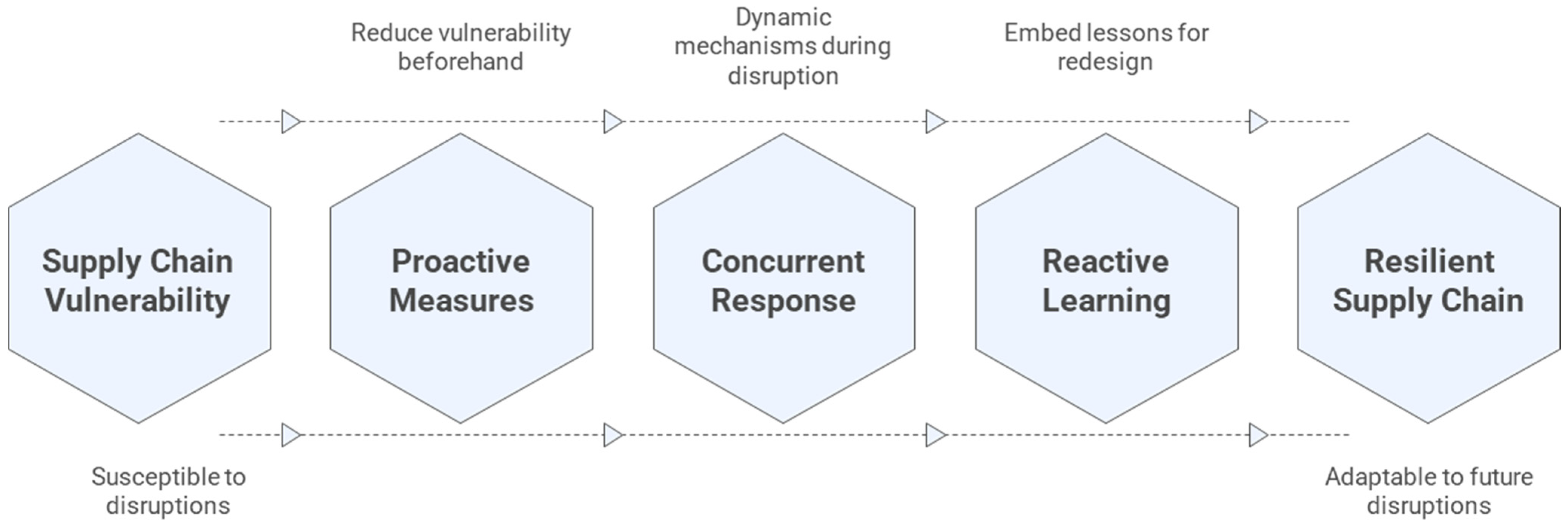 - Post-disruption (Reactive and Learning): recovery mechanisms are coupled with organizational learning and reconfiguration, anchoring the lessons learned from the disruption and making them the first barriers to anticipate new potential disruptions [32].