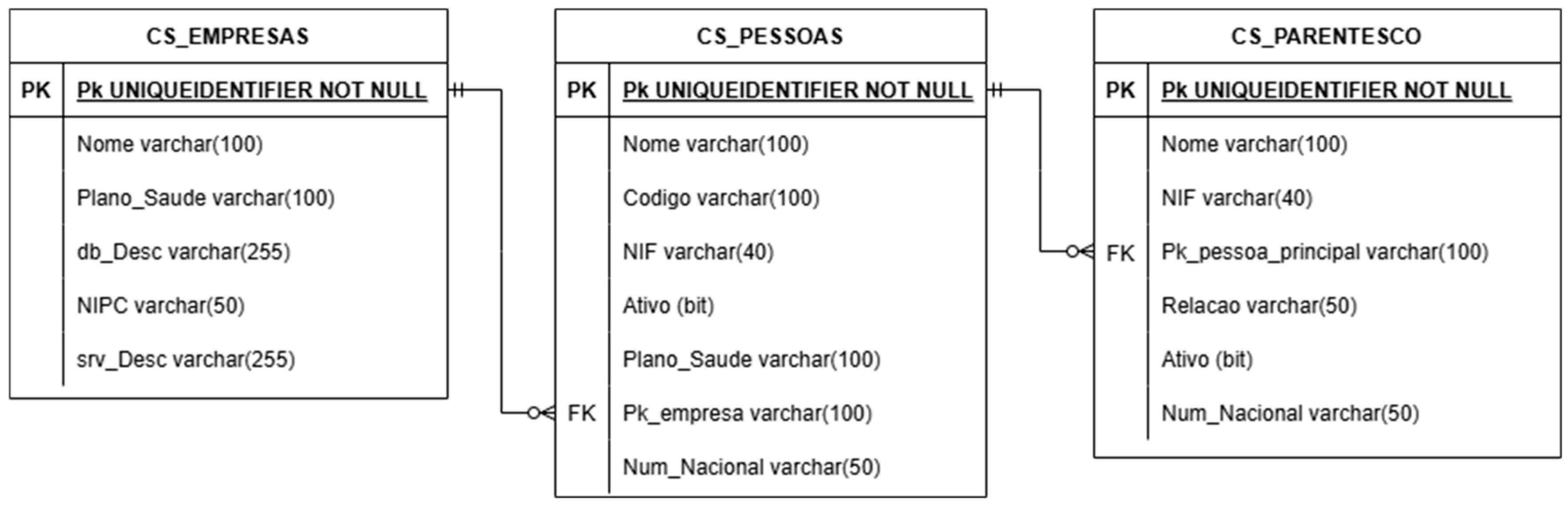 Based on the system requirements identified, we developed an Entity-Relationship Diagram (ERD) to structure the DB and define how the data would be organized and interconnected. The ERD highlighted the relationships between the main tables, specifically the foreign key constraints. The PESSOAS table is linked to the EMPRESAS table through a foreign key, ensuring each cardholder is associated with their respective company. Similarly, the FAMILIARES table is linked to the PESSOAS table, establishing a relationship between family members and their primary cardholder. These relationships are essential for maintaining data integrity and supporting the automated update processes.