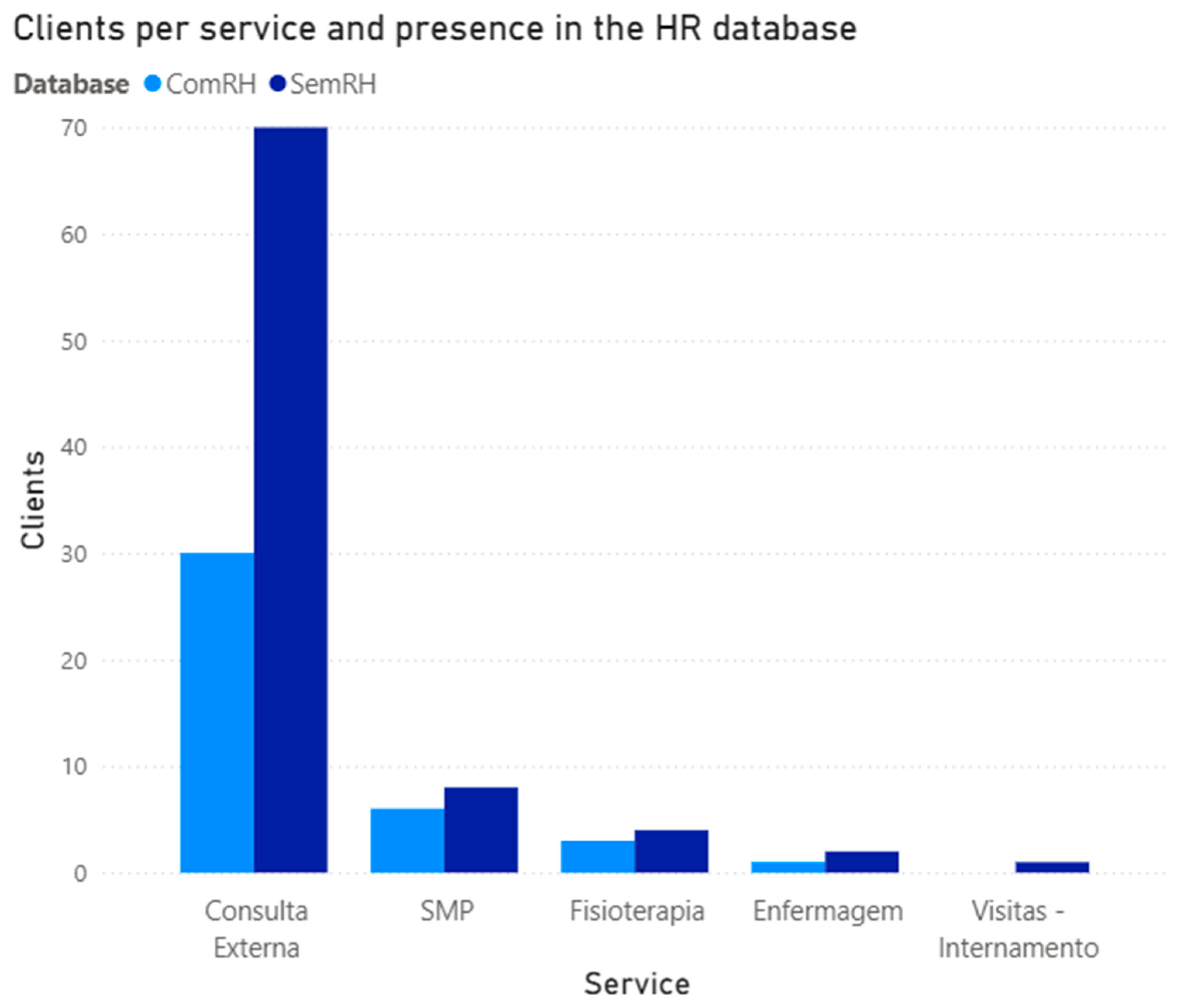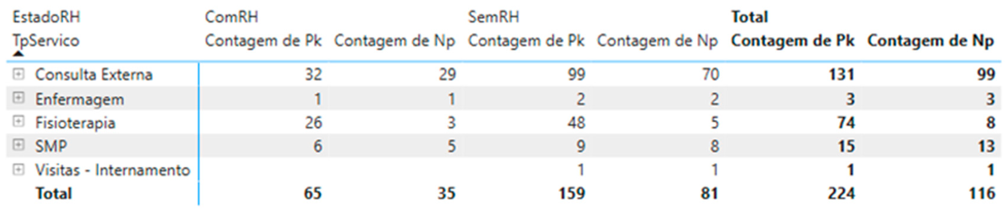 Building on these performance improvements, we conducted an initial operational analysis to evaluate the system’s functionality, scope, and usage across service types. Rather than limiting our assessment to the post-implementation period, data collection began when the system was ready for deployment. Although the official rollout was delayed at the start of May, the system was prepared and suitable for early evaluation. This approach ensures we capture the solution’s benefits from its earliest operational stage. It is important to note that the DB remains limited, particularly regarding information on family members and Silver plan employees. Consequently, our analysis focused on card usage by service and specialty, comparing the total number of consultations (Pk) to the distinct number of users (Np) who booked them. Users were further categorized as ComRH (present in the new DB and eligible for verification) or SemRH (not yet in the new DB and therefore not eligible for automated verification) (see