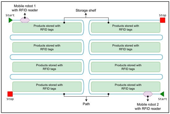 An autonomous mobile robot equipped with UHF RFID technology was proposed for periodic inventory operations. Within the theoretical model, the following configuration was chosen (Figure 5):